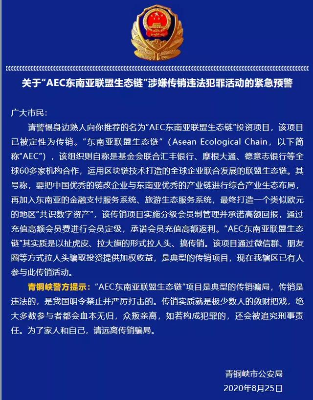 近日,青銅峽市公安局發(fā)布“關于‘AEC東南亞聯(lián)盟生態(tài)鏈’涉嫌傳銷違法犯罪活動的緊急預警”。