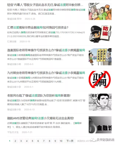 隨著互聯(lián)網(wǎng)的普及,網(wǎng)絡(luò)維權(quán)之風(fēng)盛行。然而,已有灰色產(chǎn)業(yè)盯上這片新“藍(lán)?!保⒔铏C(jī)牟利。 券商中國(guó)記者調(diào)查發(fā)現(xiàn),近期虛假網(wǎng)絡(luò)維權(quán)“碰瓷”金融機(jī)構(gòu)的情況頗有抬頭之勢(shì)。相關(guān)個(gè)人或機(jī)構(gòu)打著“代理維權(quán)”的幌子,通過“制作文章模板-人工干預(yù)細(xì)節(jié)文本-批量生產(chǎn)文章”的套路,在網(wǎng)絡(luò)上發(fā)布經(jīng)某某“職業(yè)維權(quán)”協(xié)助成功追回的“案例”,將編造的海量負(fù)面信息作為引流手段,吸引投資者支付維權(quán)費(fèi)。 正是在投資者的盲目相信、代維機(jī)構(gòu)的肆意渲染和渠道平臺(tái)的放任縱容下,網(wǎng)絡(luò)維權(quán)已然形成了一條完整的“產(chǎn)業(yè)鏈”。這種灰色的“產(chǎn)業(yè)鏈”,除了導(dǎo)致投資者可能遭遇詐騙之外,海量的負(fù)面信息也給證券行業(yè)以及各家證券機(jī)構(gòu)的聲譽(yù)造成嚴(yán)重影響。其中,證券投資咨詢機(jī)構(gòu)遭遇“碰瓷”的頻率最高,近期已有多家機(jī)構(gòu)關(guān)注并發(fā)布澄清聲明。 網(wǎng)絡(luò)維權(quán)海量信息涌現(xiàn) “驚天黑幕”、“騙局大曝光”、“虧損內(nèi)幕揭曉”、“慘痛經(jīng)歷自述”……如此駭人聽聞的描述和形容,真是投資者發(fā)自肺腑的傾訴,還是別有用心者的惡意渲染? 隨著資本市場(chǎng)的快速發(fā)展和國(guó)民財(cái)富的不斷累積,投資者數(shù)量呈現(xiàn)爆發(fā)式增長(zhǎng),投資意識(shí)和對(duì)資本造假的維權(quán)意識(shí)也在增強(qiáng)。然而,在互聯(lián)網(wǎng)信息的“無孔不入”之下,已有灰色產(chǎn)業(yè)盯上網(wǎng)絡(luò)維權(quán)這片新“藍(lán)?!薄?/span> 在百度搜索引擎上,無論是頭部券商、大型期貨公司,還是證券投資咨詢公司,均有大量維權(quán)信息映入眼簾。據(jù)業(yè)內(nèi)人士介紹,這樣的現(xiàn)象自2019年興起,今年上半年以來數(shù)量明顯增加。