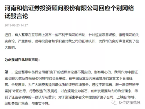 此外,在雪球、今日頭條、知乎等新興的社交、資訊類平臺(tái),記者都發(fā)現(xiàn)了大量發(fā)布代維信息的蹤跡。 機(jī)構(gòu)束手無力反擊 通過調(diào)查不難看出,相關(guān)個(gè)人或機(jī)構(gòu)打著“代理維權(quán)”的旗號(hào),通過“制作文章模板-人工干預(yù)細(xì)節(jié)文本-批量生產(chǎn)文章”的套路,在網(wǎng)絡(luò)上發(fā)布經(jīng)某某“職業(yè)維權(quán)”協(xié)助成功追回的所謂“案例”,將編造的海量負(fù)面信息作為引流手段,吸引投資者支付維權(quán)費(fèi)。 據(jù)技術(shù)團(tuán)隊(duì)介紹,部分機(jī)構(gòu)還可結(jié)合SEO(搜索引擎優(yōu)化)技術(shù),聯(lián)系部分網(wǎng)站站長(zhǎng),加大信息在搜索引擎的權(quán)重,獲取大量曝光,這也是相關(guān)維權(quán)信息鋪天蓋地的原因所在。 維權(quán)信息真假交織,對(duì)于投資者來說,需要承擔(dān)30%的服務(wù)費(fèi)和被詐騙的風(fēng)險(xiǎn)。對(duì)于正規(guī)機(jī)構(gòu)來說,是公司名譽(yù)的嚴(yán)重?fù)p失和抹黑。其中,證券投資咨詢機(jī)構(gòu)遭遇“碰瓷”的頻率最高。 在券商中國(guó)記者獲取的一段代維廣告中顯示,“服務(wù)費(fèi)說白了是,空手套白狼。不夸張的說,這些所謂的股票咨詢公司本質(zhì)就是誘導(dǎo)股民交納高額的服務(wù)費(fèi),交費(fèi)之后服務(wù)態(tài)度也明顯變差,你的盈虧對(duì)與他們來說已經(jīng)不重要了?!比绱诵稳荩苯宇嵏擦俗C券投資咨詢機(jī)構(gòu)的商業(yè)模式。 券商中國(guó)記者發(fā)現(xiàn),自2019年以來,已有大量證券投資咨詢機(jī)構(gòu)注意到相關(guān)詆毀信息并發(fā)布聲明,如河南和信證券投資咨詢、大摩證券投資咨詢、江蘇天鼎證券投資咨詢等。