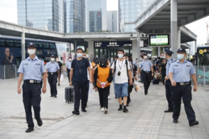 8月20日18時(shí)許,一列“特殊”的列車在深圳福田站緩緩?fù)?浚?1名因涉嫌網(wǎng)絡(luò)交友詐騙的犯罪嫌疑人在民警的押解下走出列車車門。