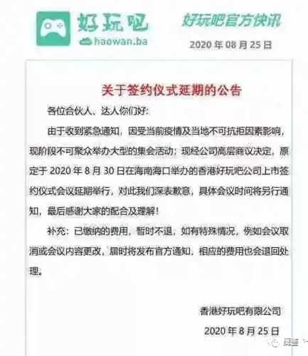 除了上述宣傳外,該文章還稱,“孫運(yùn)動(dòng)告訴筆者,好玩吧是真正的全員持股企業(yè),只要注冊成為好玩吧用戶,就享有公司相應(yīng)的股權(quán)積分。孫運(yùn)動(dòng)強(qiáng)調(diào),從目前發(fā)展勢頭看,好玩吧在2022年上市納斯達(dá)克的戰(zhàn)略目標(biāo)是完全可能實(shí)現(xiàn)的。屆時(shí),同阿里巴巴當(dāng)年批量造富一樣,好玩吧也一定會(huì)產(chǎn)生數(shù)量可觀的千萬級富豪?!?/p> 好玩吧有限公司在8月10日發(fā)布的公告中顯示,好玩吧有限公司決定在2020年8月底或9月初在海南??谑姓匍_發(fā)布會(huì)。發(fā)布會(huì)的主要內(nèi)容包括好玩吧香港上市簽約儀式、上市后公司重大發(fā)展戰(zhàn)略,以及合伙人培訓(xùn)會(huì)等等。 8月25日,好玩吧有限公司突然發(fā)布公告表示好玩吧香港上市簽約儀式將進(jìn)行延期舉報(bào)。其理由是“受當(dāng)前疫情影響以及當(dāng)?shù)夭豢煽咕芤蛩赜绊憽!?/p>