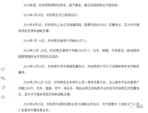 該文章還稱,“好玩吧”從正式上線試運(yùn)行到今年的4月15日平臺(tái)注冊用戶為16468956人?!昂猛姘伞睆?018年底到2020年4月15日期間,先后獲得知初資本、蠻子基金、礪石創(chuàng)投的聯(lián)合天使投資,并與京東、國美、蘇寧、拼多多、唯品會(huì)等主流電商平臺(tái),以及諾利亞影業(yè)、電魂網(wǎng)絡(luò)先后正式簽署協(xié)議,互為對方提供項(xiàng)目支持和戰(zhàn)略支撐。