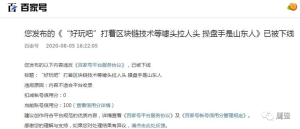 發(fā)表時(shí)間:2020-09-03 18:43作者:鷹鑒來源:鷹鑒 8月5日,有公關(guān)公司聯(lián)系鷹鑒讓我們刪除發(fā)布的《“好玩吧”打著區(qū)塊鏈技術(shù)等噱頭拉人頭 操盤手是山東人》文章,并承諾給“辛苦費(fèi)”。當(dāng)鷹鑒拒絕后比較詭異的事情發(fā)生了。當(dāng)天下午4點(diǎn)22分該篇預(yù)警文章卻被強(qiáng)制下線了。