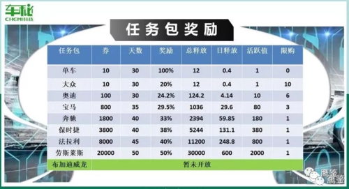 在一篇“車秘Miti賺錢模式視頻圖片詳解”的文章中顯示,“任務包”是“掌上車秘”APP對應9個不同任務等級的代名詞,“任務包”從低到高分別是“單車”、“大眾”、“奧迪”、“寶馬”、“奔馳”、“保時捷”、“法拉利”、“勞斯萊斯”、“布加迪威龍”。而“任務包”的等級越高,總數(shù)量和活躍指也越高。越高級的“任務包”,兌換所需“劵”越多,釋放的“劵”也就越多。