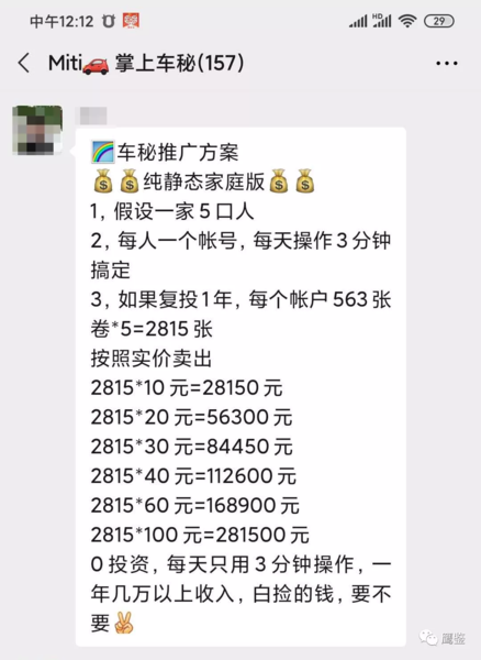 在該群里面有人假設(shè)一家5口人加入,通過上述純靜態(tài)模式每天操作3分鐘,并復投1年就能獲得2815張“券”,每張“卷”按10元賣出計算就是近3萬元,如果是100元賣出就是28.15萬元。