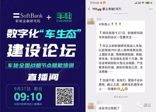 就在昨天,有群成員稱,“9月27日孫正義的軟銀金融研究院加入了車秘,以后幫助Miti進入各種場景應用,上國際大盤,用券換原始股,券還會幫助別的大型企業(yè)賦能,產(chǎn)生更多的價值,券的價格會讓您,無法想象……”
