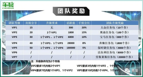 鷹鑒了解到,會員除了通過靜態(tài)模式能獲取收益外,還可以通過推廣的方式獲得動態(tài)收益。在上述文章中提到,“掌上車秘”還設(shè)置了VIP模式,只有達到晉升的條件就成為VIP會員獲得“任務包”和全球分紅獎勵,并宣稱VIP會員每個月能有1000元到35萬元不等的收入。