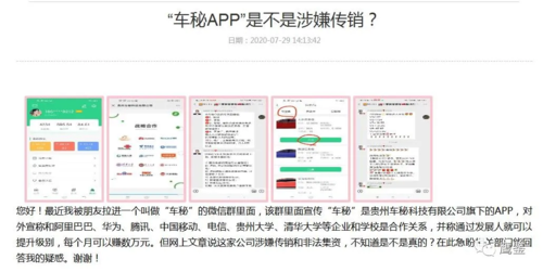 就此,鷹鑒通過貴陽市網(wǎng)絡(luò)問政平臺反映咨詢“掌上車秘”APP是不是涉嫌傳銷行為。