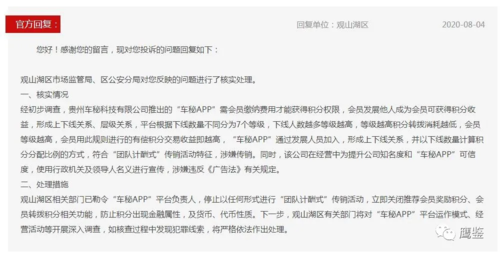 隨后,觀山湖區(qū)市場監(jiān)管局、區(qū)公安分局對鷹鑒反映“車秘APP”涉嫌傳銷的問題回復到,“車秘”APP通過發(fā)展人員加入,形成上下線關(guān)系,并以下線數(shù)量計算積分分配比例的方式,符合“團隊計酬式”傳銷活動特征,涉嫌傳銷,并勒令“車秘”APP平臺負責人,停止以任何形式進行“團隊計酬式”傳銷活動,立即關(guān)閉推薦會員獎勵積分、會員轉(zhuǎn)撥積分相關(guān)功能,防止積分出現(xiàn)金融屬性,及貨幣、代幣性質(zhì)。