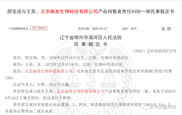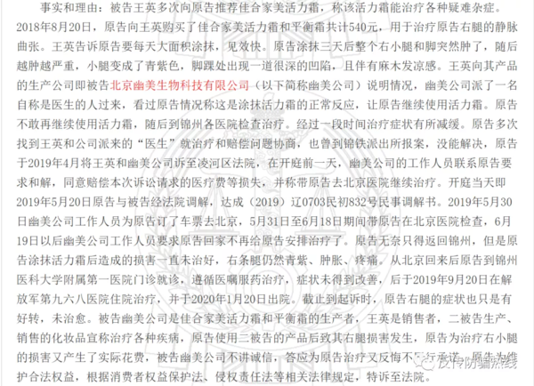 2020年9月27日,中國裁判文書網(wǎng)發(fā)布了一則關(guān)于北京幽美生物科技有限公司(以下簡稱幽美生物)產(chǎn)品銷售責任糾紛裁定書。裁定書顯示,幽美生物銷售王某多次向原告邵某推薦佳合家美活力霜,稱該活力能治療各種疑難雜癥。2018年8月,原告邵某購買了活力霜和平衡霜,用于治療原告右腿的筋脈曲張。不過涂抹了三天之后,不見好反而病情加重,只得去醫(yī)院治療。