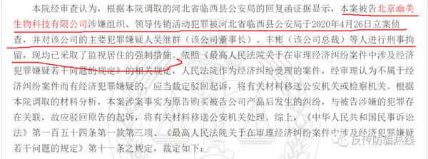 值得注意的是,本則裁定書提到了一個關(guān)鍵信息,“根據(jù)本院調(diào)取的河北省臨西縣公安局的回復函證據(jù)顯示,本案被告北京幽美生物科技有限公司涉嫌組織、領(lǐng)導傳銷活動犯罪被河北省臨西縣公安局于2020年4月26日立案偵察,并對該公司的主要犯罪嫌疑人吳繼群(該公司董事長)、豐彬(該公司總裁)等人進行刑事拘留,現(xiàn)均已采取了監(jiān)視居住的強制措施?!?/span>