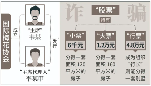 韋某與李某甲經(jīng)商議成立了“國際梅花協(xié)會”組織,并開始發(fā)行“股票”?!肮善薄狈譃椤靶∑薄薄按笃薄薄靶衅薄比N,分別對應(yīng)人民幣6000元、1.2萬元和4.8萬元。購買“小票”成為“股民”,可以分得一套面積120平方米的房子,購買“大票”可分到面積160平方米以上的房子,持有“行票”成為組織“行長”則能分得一套別墅,另由“國際梅花協(xié)會”組織給家人安排工作,擔(dān)任組織下設(shè)銀行的行長并享受分紅。