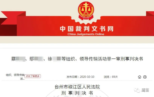 發(fā)表時(shí)間:2020-10-16 18:20作者:鷹鑒來(lái)源:鷹鑒 10月10日,臺(tái)州市椒江區(qū)人民法院對(duì)外披露了“福龍家園”特大網(wǎng)絡(luò)傳銷案的刑事判決書(shū)。鷹鑒在該判決書(shū)上看到,“福龍家園”操盤(pán)手蔡林龍以及鄢某蘭等7名被告人除了被判處有期徒刑,并處罰金外,法院還判處涉案贓款和財(cái)產(chǎn)按比例退還被害人,不足部分還責(zé)令各被告人繼續(xù)退賠并返還被害人。