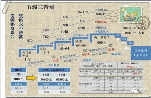 分三級五晉制(五級三晉制),也就是三個不同級別階段和EDCBA五個晉職位制度。業(yè)務(wù)員到組長是一個級別,主任到經(jīng)理是一個級別,老總是一個級別。加入者以家為單位,聽從上線安排,利用組織返還的19000,在高檔小區(qū)租房,買品牌服飾,購置金銀首飾,塑造暴發(fā)形象,有利拉人頭。發(fā)展3個直接下線,3個下線又發(fā)展9,依此類推,9變成27,27變成81,81變成243人……加入者依靠從新發(fā)展的下線中得到抽成;