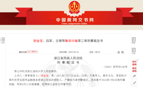 2020年8月12日,浙江省高院作出二審判決:駁回上訴,維持原判——祺天優(yōu)貸實(shí)控人胡金寶犯集資詐騙罪,判處無(wú)期徒刑,剝奪政治權(quán)利終身,并處沒收個(gè)人全部財(cái)產(chǎn);其余五名被告分別因非法吸收公眾存款罪、集資詐騙罪獲刑并處罰金。