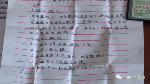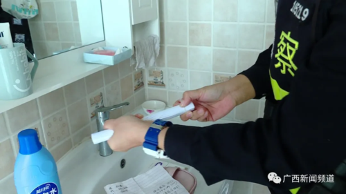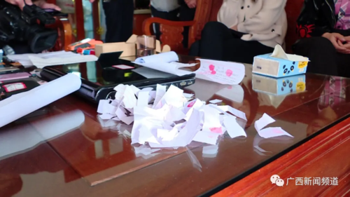 南寧市公安局腰塘派出所民警   黃嵐:各種理由想上廁所,我們就對廁所和人身進行了例行檢查,在她們身上直接在口袋里就搜出了已經(jīng)撕碎的相關(guān)的學習資料。我進廁所搜的時候,就在她化妝包里面,發(fā)現(xiàn)有一些東西,這是學習心得之類的,然后牙膏盒里面有一沓東西。