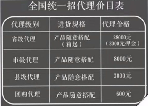 這兩則行政裁定書只公布了資金凍結(jié)相關(guān)信息,對于姬存希涉嫌傳銷的具體行為沒有進行披露。據(jù)知情人士向李旭反傳銷團隊透露,姬存希對外宣傳的代理就有4個級別,分別是2.8萬元省代、8000元市代、3000元縣代、600元團購(VIP),其中省代和市代分別需要繳納保證金1000元和300元。