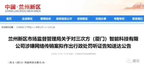 發(fā)表時間:2020-11-11 16:45作者:鷹鑒來源:鷹鑒 11月10日,鷹鑒從蘭州新區(qū)市場監(jiān)督管理局獲悉,該局擬對廈門三次方智能科技有限公司(以下簡稱:三次方公司)、觸信(廈門)智能科技有限公司(下稱:觸信公司)涉嫌網(wǎng)絡傳銷一案作出行政處罰。