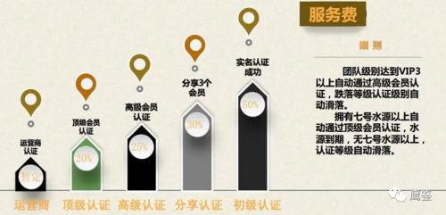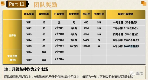 PPT上還顯示,“水天共享”APP還設(shè)置了團(tuán)隊(duì)獎(jiǎng)勵(lì)。根據(jù)發(fā)展下線的數(shù)量,可以逐級(jí)晉升為VIP1到VIP5,VIP用戶可以獲得4%到18%不等的手續(xù)費(fèi)分紅以及12個(gè)到4600個(gè)不等的“源點(diǎn)”獎(jiǎng)勵(lì)。級(jí)別越高獲得的手續(xù)費(fèi)分紅就越低,獲得的“源點(diǎn)”獎(jiǎng)勵(lì)也就越多。