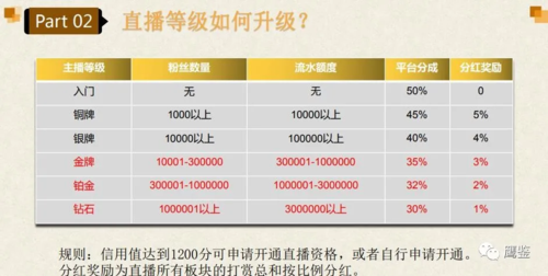 例如,信用值達(dá)到1200分的用戶就可自行申請(qǐng)開通直播資格,直播用戶可以通過直播的方式招攬粉絲,粉絲數(shù)量達(dá)到1000以上,直播等級(jí)就可以升級(jí)為銅牌,1萬以上升級(jí)為銀牌,粉絲數(shù)量達(dá)到1萬以上30萬以下為金牌,達(dá)到30萬以上100萬以下為鉑金,當(dāng)粉絲數(shù)量大于100萬,就升級(jí)為最高級(jí)別的鉆石級(jí)別。