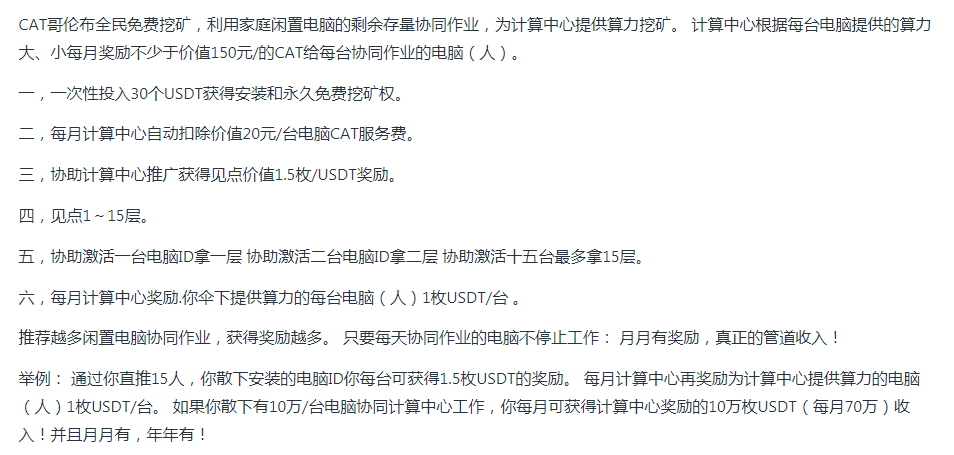 經工作發(fā)現(xiàn),“哥倫布”是一個以區(qū)塊鏈為噱頭的開發(fā)平臺,推廣其公司的“礦機”進行挖礦,鼓吹國際認可,國家支持挖得的CAT幣將來可在市場上自由流通,升值前景好。并承諾會員發(fā)展他人后會提高自己挖礦速度,并會獲得一定數(shù)額的虛擬幣,以此來達到發(fā)展會員購買礦機的目的,收取會員資金。