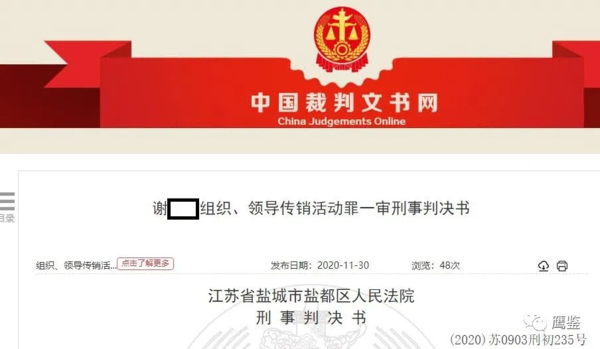11月26日,江蘇省鹽城市鹽都區(qū)人民法院對該起特大網(wǎng)絡(luò)傳銷案進行了宣判。鷹鑒獲悉,被告人謝某瓊因構(gòu)成、組織領(lǐng)導傳銷活動罪,被判處5年以上的有期徒刑,并處罰金百萬元。