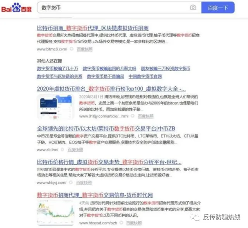 采訪中記者發(fā)現(xiàn),隨著區(qū)塊鏈、數(shù)字貨幣等金融科技及數(shù)字經(jīng)濟(jì)時代產(chǎn)物的不斷發(fā)展,利用投資者認(rèn)知等方面的信息不對稱,披著數(shù)字資產(chǎn)理財外衣的各種虛擬貨幣理財平臺也逐漸活躍起來。在百度搜索引擎中鍵入“數(shù)字貨幣”“數(shù)字人民幣”“區(qū)塊鏈”等關(guān)鍵字,虛擬貨幣代理等招商推廣信息便會夾雜出現(xiàn)在搜索結(jié)果中。