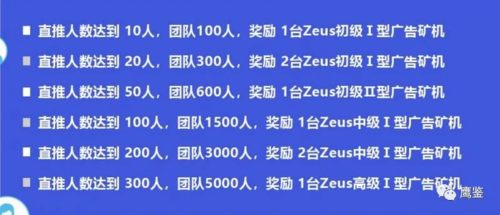 達(dá)人獎(jiǎng)勵(lì)是指,參與者的直接發(fā)展的下線或團(tuán)隊(duì)人數(shù)達(dá)到一定的數(shù)量以后,就可以獲得礦機(jī)獎(jiǎng)勵(lì),發(fā)展的下線越多,獲得的礦機(jī)獎(jiǎng)勵(lì)就越多,種類也更高。例如,直推人數(shù)達(dá)到 10人,團(tuán)隊(duì)100人,獎(jiǎng)勵(lì)1臺(tái)Zeus初級(jí)Ⅰ型廣告礦機(jī);當(dāng)直推人數(shù)達(dá)到300人,團(tuán)隊(duì)5000人,就獎(jiǎng)勵(lì)1臺(tái)Zeus高級(jí)I型廣告礦機(jī)。