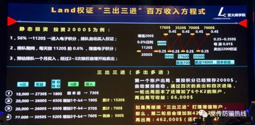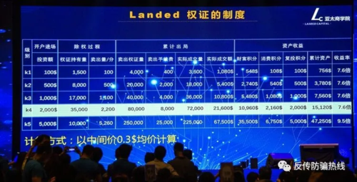 該集團(tuán)以推銷“l(fā)and權(quán)證”、乳膠產(chǎn)品、設(shè)立“天然乳膠生活館”獲取高額返利等形式發(fā)展會(huì)員。會(huì)員通過繳納125美元至12500美元(折合人民幣825元至87500元)6檔不同金額的入會(huì)費(fèi)后,成為K1至K6級(jí)別的會(huì)員,獲得與其級(jí)別對(duì)應(yīng)的產(chǎn)品積分以及l(fā)and權(quán)證,產(chǎn)品積分可以兌換乳膠產(chǎn)品,land權(quán)證根據(jù)會(huì)員增加可增值拆分,會(huì)員可以借此獲得靜態(tài)收益。除獲取靜態(tài)收益外,會(huì)員發(fā)展下線可獲取直推獎(jiǎng)、對(duì)碰獎(jiǎng)、管理獎(jiǎng)、見點(diǎn)獎(jiǎng)等動(dòng)態(tài)積分獎(jiǎng)勵(lì)。經(jīng)查,截至案發(fā)時(shí),“DT平臺(tái)”會(huì)員層級(jí)540余層,吸納會(huì)員16余萬(wàn)人。
