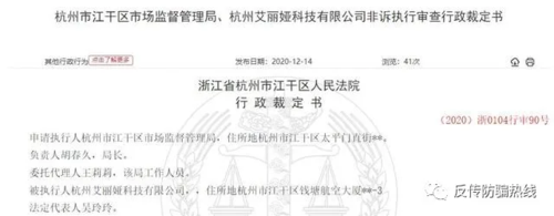 杭州艾麗婭違反傳銷法遭罰沒87萬 未執(zhí)行裁定又罰50萬