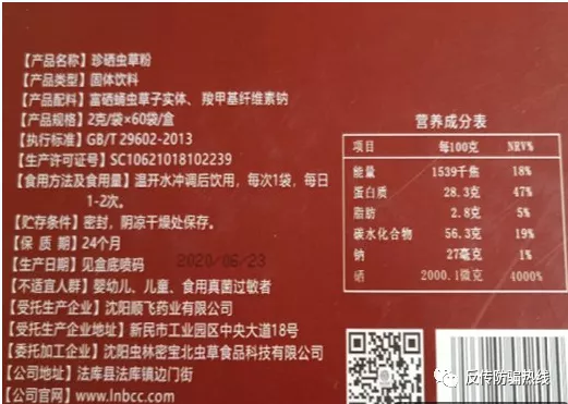 8月2日,該公眾號又發(fā)布標(biāo)題為《與老兵一起為祖國送祝福——生物時代“輝煌歲月 壯麗人生”老戰(zhàn)士聯(lián)誼會成功舉行》的文章,其中寫道“8月1日上午,生物時代“‘輝煌歲月 壯麗人生’2020年度八一老戰(zhàn)士聯(lián)誼會”在沈陽某酒店隆重舉.....”“生物時代為老兵們準(zhǔn)備了價值7000多元的珍硒蟲草粉大禮包。期待這一款由陳浩成董事長與恩師王升厚教授傾注心血、共同打造的健康食品,能夠為老兵的健康保駕護(hù)航”。生物時代的總裁于慶和出席了活動。目前,該公眾號仍將陳浩成稱為董事長,并持續(xù)發(fā)布其相關(guān)內(nèi)容。 中國網(wǎng)財經(jīng)記者在搜索網(wǎng)站上進(jìn)行“陳浩成 珍硒蟲草粉”的相關(guān)內(nèi)容,發(fā)現(xiàn)其中一款“珍硒蟲草粉”所用商標(biāo)正是“陳浩成生物時代”,該產(chǎn)品盒身上并未標(biāo)明研發(fā)、經(jīng)營企業(yè),僅顯示委托加工、生產(chǎn)企業(yè)。