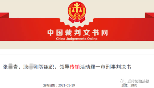 1月19日,李旭反傳銷團隊獲悉, 中國裁判文書網(wǎng)公布一則《張某青、耿某剛等組織、領導傳銷活動罪一審刑事判決書》。臨汾市堯都區(qū)人民法院宣判一起傳銷案,張某青、耿某剛等11名被告人犯組織、領導傳銷活動罪,判處有期徒刑三年六個月至一年三個月,并處罰金。