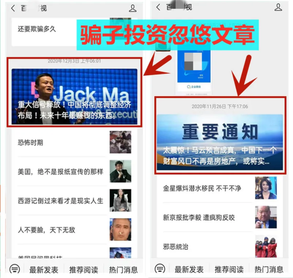 利箭揭露這種騙局很多次了,當(dāng)你在任何公眾號(hào)里面發(fā)現(xiàn)有這樣打著馬云旗號(hào)的文章,你就要小心了,這是誘導(dǎo)你進(jìn)行“投資”交錢的詐騙,千萬(wàn)不要上當(dāng)被騙!一旦被騙,你連騙子是誰(shuí)都找不到,因?yàn)檫@種外接廣告,占用了騰訊的資源,連騰訊都恨之入骨!