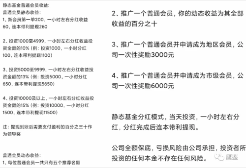 不過,小編發(fā)現(xiàn),“天弘基金”項(xiàng)目有靜態(tài)收益和動(dòng)態(tài)收益模式兩種,并承諾由公司全額保底,虧損風(fēng)險(xiǎn)由公司承擔(dān),投資者所投資的任何本金不存在任何風(fēng)險(xiǎn)。