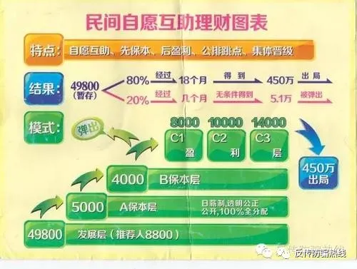 其中互助層的每個(gè)新會(huì)員需要交納51000元,(之前為49800元)暫存給紅心1,紅心1將51000元暫存金直接進(jìn)行分紅,其中紅心3分14000,紅心2分10000元,紅心1分8000元,互助2分4000元,互助1分5000元,每介紹一個(gè)新成員,介紹人再分7800元,紅心1、紅心2、紅心3分別拿出1000元,這3000元用來作為激勵(lì)獎(jiǎng)返還給新人,剩余2200元作為“慈善基金”交給“眾愛聯(lián)盟”。同時(shí)“眾愛聯(lián)盟”要求每個(gè)成員必須發(fā)展至少三名新成員,否則當(dāng)其晉級(jí)到互助2就予以出局。