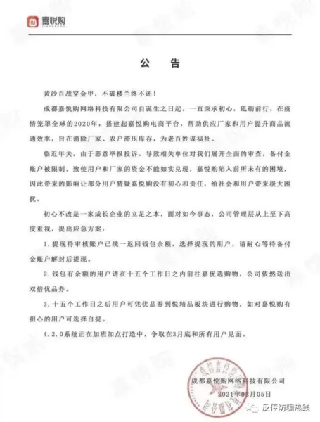 在嘉悅購APP購買產(chǎn)品,用戶想要省錢,必須使用優(yōu)品券,而優(yōu)品圈只能在嘉優(yōu)購物區(qū)產(chǎn)生。也就是說,嘉悅購用優(yōu)惠券的方式套牢用戶,不僅需要用戶為其拉新,還將用戶的現(xiàn)金源源不斷的套在APP內(nèi),為獲得優(yōu)惠而花費了更多的錢,充分利用了消費者愛占便宜的心理。 有網(wǎng)友稱,“這就是一個資金盤,圈一波跑路的,跟18年卷款350億的易網(wǎng)購有啥區(qū)別!一瓶洗發(fā)水十多塊錢賣五六十,26天返你!” 據(jù)了解,嘉悅購的模式想賺錢必須要拉人。因此,不少用戶開小號,自己賺自己的傭金,這樣可以讓盤內(nèi)資金相對充足。但這也意味著平臺沒有實際的新用戶和新的訂單,都是投機倒把通過自己開小號提現(xiàn),資金鏈必然會斷裂。 另有知乎網(wǎng)友評論稱,“100塊買袋大米,返200券,要么換成券,要么換成米,換成米再加60,也就是160元買了三袋米,實際上,一袋米原本也就50多元,差別不大;而換錢就是傳銷套路,相當(dāng)于100元買了一袋50元的米,然后再忽悠兩個人花100元買袋50元的米,你就賺60元,賣不出去你就虧50元。 有消息人士透露,近日,有人去成都嘉悅購公司,發(fā)現(xiàn)里面只剩下前臺,實控人李曼已失聯(lián)跑路,嘉悅購公司也已被天府新區(qū)調(diào)查。 目前,“嘉悅購官網(wǎng)”微信公眾號暫停已更新于1月28日,同時,嘉悅購APP也無法登錄。2月5日,成都嘉悅購發(fā)布公告稱,公司賬戶被限制是由于惡意舉報投訴。成都嘉悅購提出,待提現(xiàn)的用戶請耐心等待賬戶解封;有余額的用戶在15日內(nèi)前往嘉優(yōu)選購物可獲得雙倍優(yōu)品券;系統(tǒng)仍在加班加點打造中,爭取在3月底與用戶見面。
