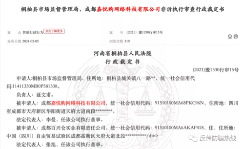 發(fā)表時間:2021-02-07 19:42作者:美商社 文 /美商社作者谷雨來源:美商社 文 /美商社作者谷雨 2月5日,中國裁判文書網(wǎng)發(fā)布了《桐柏縣市場監(jiān)督管理局、成都嘉悅購網(wǎng)絡(luò)科技有限公司非訴執(zhí)行審查行政裁定書》(以下簡稱:《行政裁定書》)。