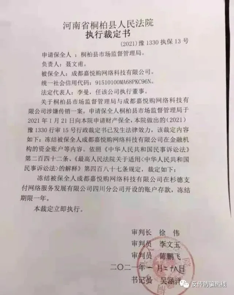 據(jù)《行政裁定書》內(nèi)容顯示,桐柏縣市場監(jiān)督管理局于2020年11月20日立案調(diào)查成都嘉悅購網(wǎng)絡(luò)科技有限公司、成都百興倉實業(yè)有限責(zé)任公司涉嫌傳銷一案,查明涉案資金流入涉案金融賬戶,為防止轉(zhuǎn)移或隱匿傳銷資金,決定向河南省桐柏縣人民法院申請對相關(guān)公司及個人有關(guān)金融機構(gòu)的案涉金融賬戶予以凍結(jié)。 法院認(rèn)為,桐柏縣市場監(jiān)督管理局在查處被申請人成都嘉悅購網(wǎng)絡(luò)科技有限公司、成都百興倉實業(yè)有限責(zé)任公司涉嫌傳銷一案中,初步核查了傳銷資金非法流動情況,其申請符合法律規(guī)定,為維護(hù)經(jīng)濟(jì)秩序、保障行政機關(guān)依法懲治傳銷行為,依照國務(wù)院《禁止傳銷條例》第十四條第一款第八項規(guī)定,裁定凍結(jié)成都嘉悅購網(wǎng)絡(luò)科技有限公司、成都百興倉實業(yè)有限責(zé)任公司在金融機構(gòu)的資金賬戶及其利用金融機構(gòu)轉(zhuǎn)移資金的相關(guān)人員李曼等55人的資金賬戶。
