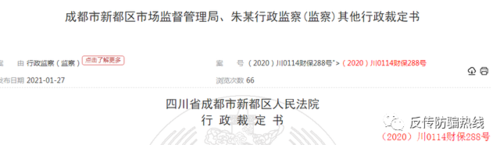 四川省成都市新都區(qū)人民法院行政裁定書((2020)川0114財(cái)保290號)和執(zhí)行裁定書((2020)川0114執(zhí)保925號)顯示,因涉嫌傳銷,成都市新都區(qū)市場監(jiān)督管理局向法院提出申請凍結(jié)被申請人朱某名下中國建設(shè)銀行平潭萬寶支行400萬元存款,申請凍結(jié)期限為1年。經(jīng)中國經(jīng)濟(jì)網(wǎng)記者比對確認(rèn),行政裁定書中的朱某為執(zhí)行裁定書中的當(dāng)事人朱烽。法院依法裁定并執(zhí)行。