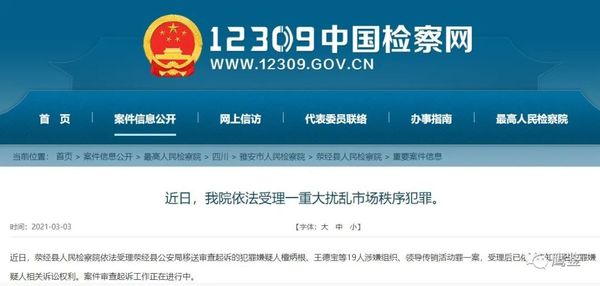 3月4日鷹鑒獲悉,四川省雅安市滎經(jīng)縣人民檢察院依法受理滎經(jīng)縣公安局移送審查起訴的犯罪嫌疑人檀炳根、王德寶等19人涉嫌組織、領(lǐng)導(dǎo)傳銷活動(dòng)罪一案,受理后已依法告知19名犯罪嫌疑人相關(guān)訴訟權(quán)利。案件審查起訴工作正在進(jìn)行中。