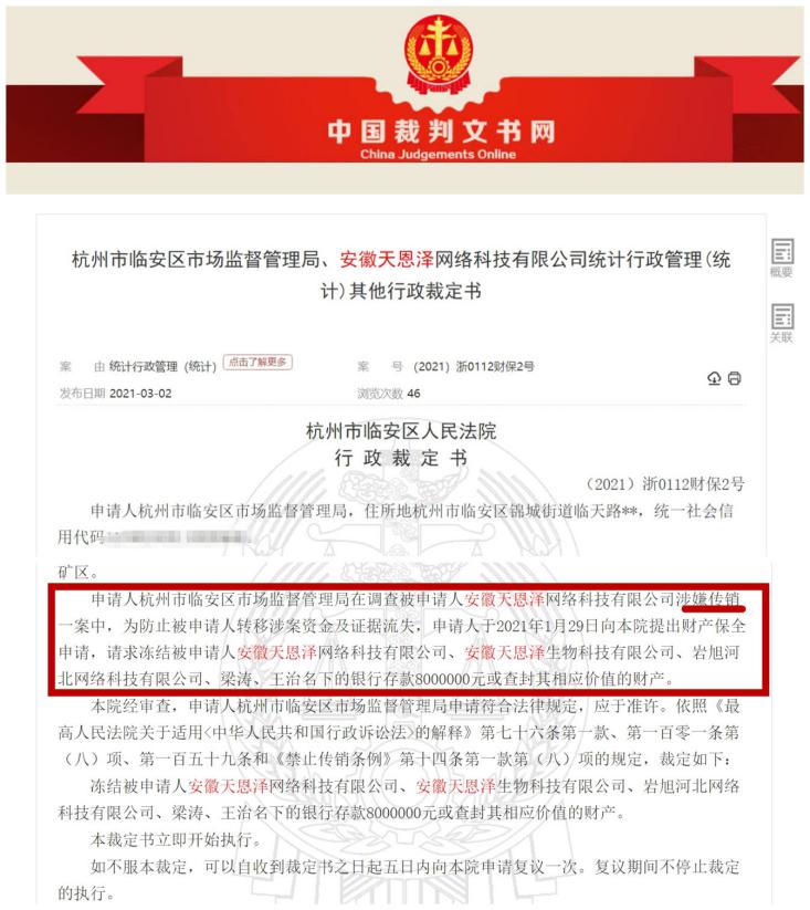 3月2日,中國(guó)裁判文書(shū)網(wǎng)發(fā)布的《杭州市臨安區(qū)市場(chǎng)監(jiān)督管理局、安徽天恩澤網(wǎng)絡(luò)科技有限公司統(tǒng)計(jì)行政管理(統(tǒng)計(jì))其他行政裁定書(shū)》(以下簡(jiǎn)稱:《行政裁定書(shū)》)顯示,杭州市臨安區(qū)市場(chǎng)監(jiān)督管理局在調(diào)查安徽天恩澤網(wǎng)絡(luò)科技有限公司涉嫌傳銷一案中,向杭州市臨安區(qū)人民法院請(qǐng)求凍結(jié)安徽天恩澤網(wǎng)絡(luò)科技有限公司、安徽天恩澤生物科技有限公司、巖旭河北網(wǎng)絡(luò)科技有限公司、梁某、王某名下的銀行存款8000000元或查封其相應(yīng)價(jià)值的財(cái)產(chǎn)。