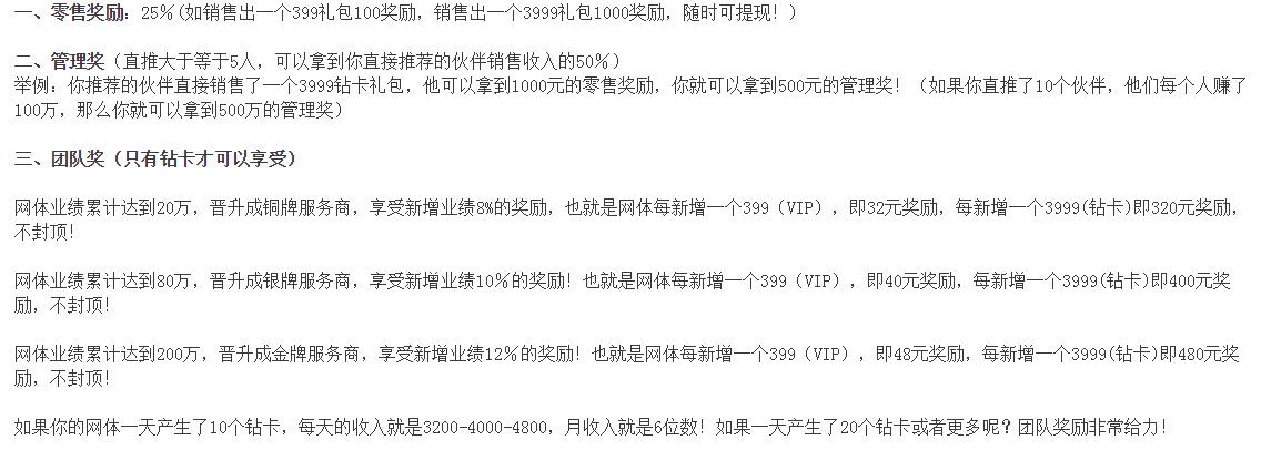 網(wǎng)體業(yè)績(jī)累計(jì)達(dá)到200萬(wàn),晉升成金牌服務(wù)商,享受新增業(yè)績(jī)12%的獎(jiǎng)勵(lì)!也就是網(wǎng)體每新增一個(gè)399(VIP),即48元獎(jiǎng)勵(lì),每新增一個(gè)3999(鉆卡)即480元獎(jiǎng)勵(lì),不封頂!認(rèn)購(gòu)399元超值禮包成VIP不可晉升級(jí)別,認(rèn)購(gòu)3999超值禮包為鉆卡可晉升級(jí)別。獎(jiǎng)勵(lì)制度中有零售獎(jiǎng)、管理獎(jiǎng)、團(tuán)隊(duì)獎(jiǎng)、榮譽(yù)獎(jiǎng)多種獎(jiǎng)勵(lì)。如管理獎(jiǎng),直接推薦一個(gè)伙伴可升級(jí)3999鉆卡禮包,可拿到1000元的零售獎(jiǎng)勵(lì),間接拿到500元的管理獎(jiǎng),如果直推了10個(gè)伙伴,他們每個(gè)人賺100萬(wàn),你就可以拿到500萬(wàn)的管理獎(jiǎng)。