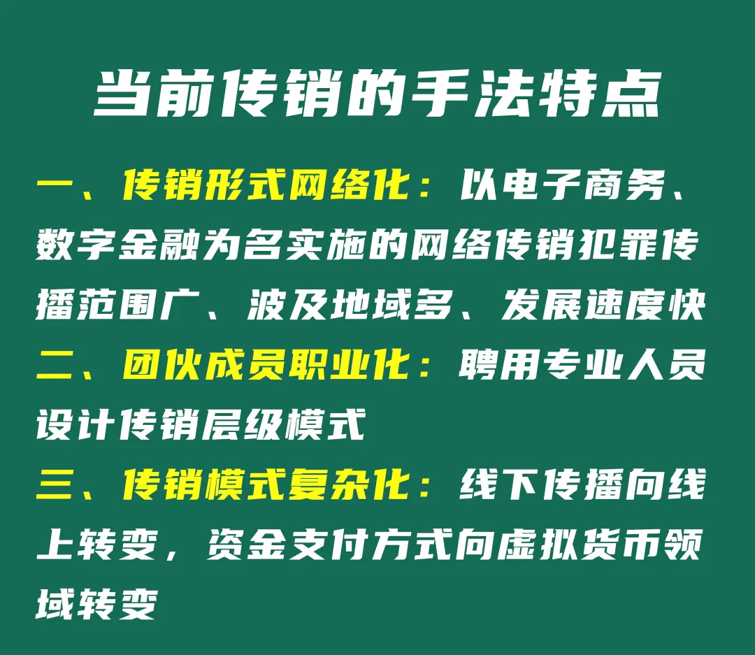對(duì)此,上海公安經(jīng)偵部門(mén)堅(jiān)持“發(fā)現(xiàn)就查、露頭就打”,不斷提升打防能級(jí)。 一是數(shù)據(jù)研判,網(wǎng)絡(luò)巡查,堅(jiān)持打早打小。 二是行刑銜接,聯(lián)動(dòng)執(zhí)法,提升打防效能。 三是普法宣傳,源頭防范,營(yíng)造社會(huì)共識(shí)。 警方提醒 廣大市民,要牢固樹(shù)立風(fēng)險(xiǎn)防范意識(shí),自覺(jué)抵制傳銷。上海公安也將持續(xù)嚴(yán)厲打擊危害市民合法權(quán)益的經(jīng)濟(jì)犯罪,切實(shí)保障消費(fèi)者合法權(quán)益。 [此文來(lái)源:警民直通車上海,版權(quán)說(shuō)明:以上文字及圖片來(lái)源于網(wǎng)絡(luò),僅供學(xué)習(xí)和交流使用,不具有任何商業(yè)用途,其目的在于傳遞更多的信息,并不代表本平臺(tái)贊同其觀點(diǎn)。版權(quán)歸原作者所有,如涉版權(quán)或來(lái)源標(biāo)注有誤,請(qǐng)及時(shí)和我們?nèi)〉寐?lián)系,我們將迅速處理,謝謝!