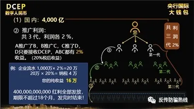 這一項(xiàng)目宣稱,企業(yè)的每一筆DCEP進(jìn)賬流水都會進(jìn)入企業(yè)的對公賬戶,進(jìn)賬流水的國家紅利2%進(jìn)入企業(yè)法人的“央行國際錢包”。