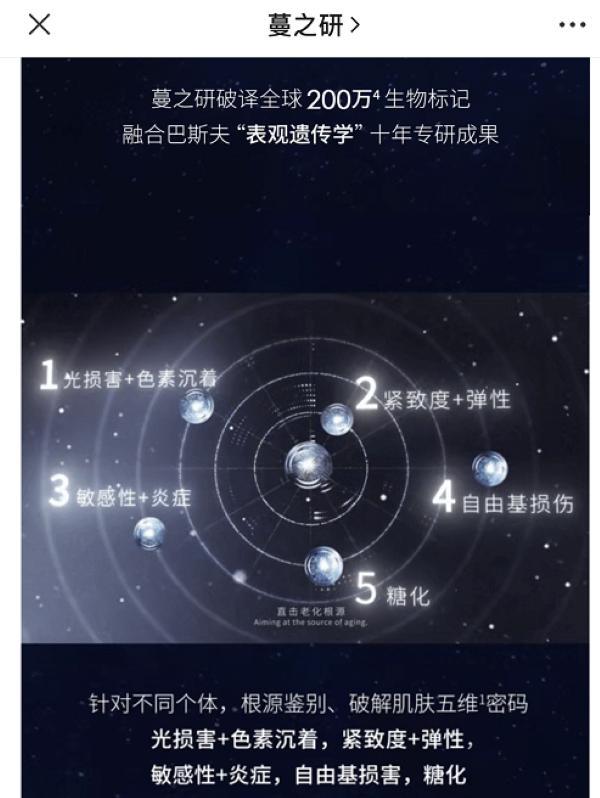 記者注意到,“蔓之研”官方微信公眾號(hào)2020年12月17日發(fā)布的“告別盲目,定向護(hù)膚,從蔓之研Skin DNA源液開(kāi)始”一文宣稱(chēng),蔓之研Skin DNA能量源液系列的5款產(chǎn)品可以降低黑色素細(xì)胞含量34%、使最大皺紋深度減少15%、炎癥因子的產(chǎn)生降低60%、細(xì)胞膜被氧化減少34%、皮膚緊致度提升58%,數(shù)據(jù)來(lái)源于巴斯夫美容護(hù)理中心(法國(guó)公司)。