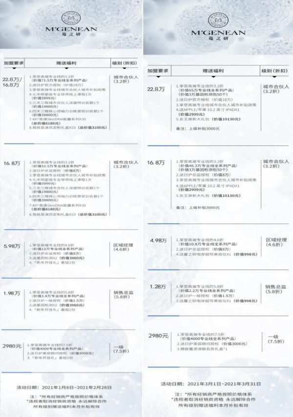 其中,一名自稱(chēng)是城市合伙人的蔓之研代理告訴記者,蔓之研專(zhuān)業(yè)線的產(chǎn)品代理有5個(gè)級(jí)別,其中,“一級(jí)”(門(mén)檻2980元)、“銷(xiāo)售總監(jiān)”(門(mén)檻1.98萬(wàn)元)、“區(qū)域經(jīng)理”(門(mén)檻5.98萬(wàn)元)、“城市合伙人”(門(mén)檻16.8萬(wàn)元/門(mén)檻22.8萬(wàn)元)4個(gè)級(jí)別代理所享受的折扣分別為7.5折、5.8折、4.6折、3.2折。