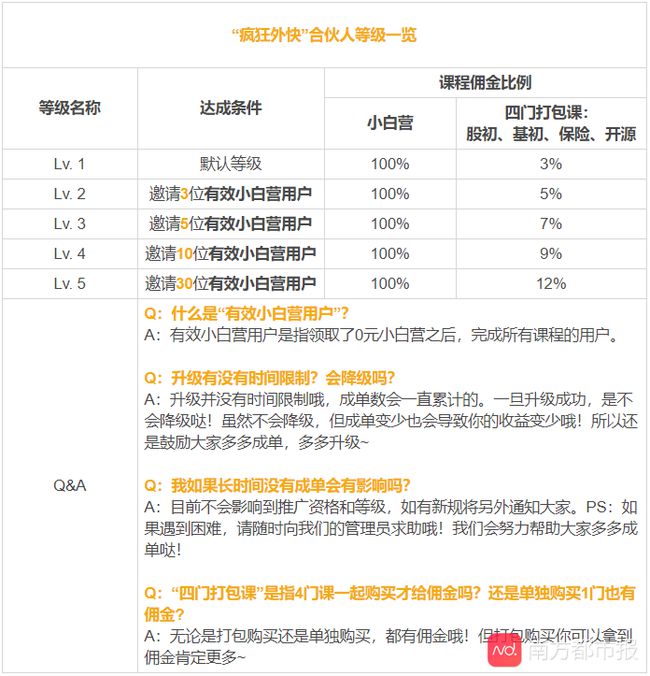 具體模式為,如果“合伙人”的朋友通過“合伙人”發(fā)出的鏈接購買了小白營這門課并完成學(xué)習(xí),則“合伙人”可以獲得100%的返傭,也就是9元。如果這個朋友后續(xù)還購買了股票、基金、保險等四門大課,則“合伙人”還可以獲得后續(xù)課程的分傭。根據(jù)查閱,“合伙人”分5個等級。5個等級的達成條件分別需要邀請0位、3位、5位、10位和30位有效用戶,而在后續(xù)課程分傭中,分別能獲取3%、5%、7%、9%和12%的返傭。