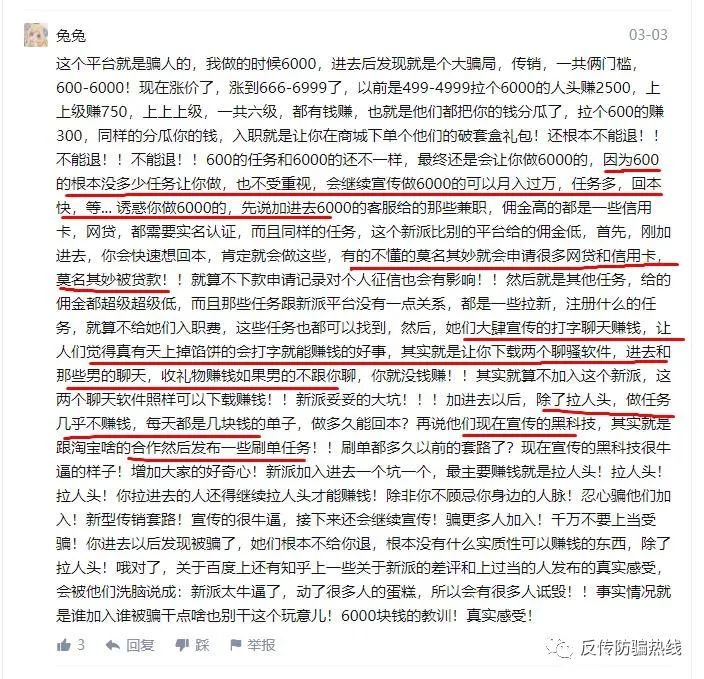 知乎網(wǎng)友兔兔表示,這個平臺就是騙人的,主要靠拉人頭賺錢,交的錢都被上級、上上級、上上上上級瓜分了。而且交600元任務(wù)非常,也不受重視,會繼續(xù)宣傳做6000可以月入過萬,任務(wù)多,回本快,打字賺錢等等。此外,一些傭金高的任務(wù)都是信用卡、網(wǎng)貸之類的,需要實名認證。一些想快速回本又不懂的人,會莫名其妙申請很多網(wǎng)貸和信用卡。