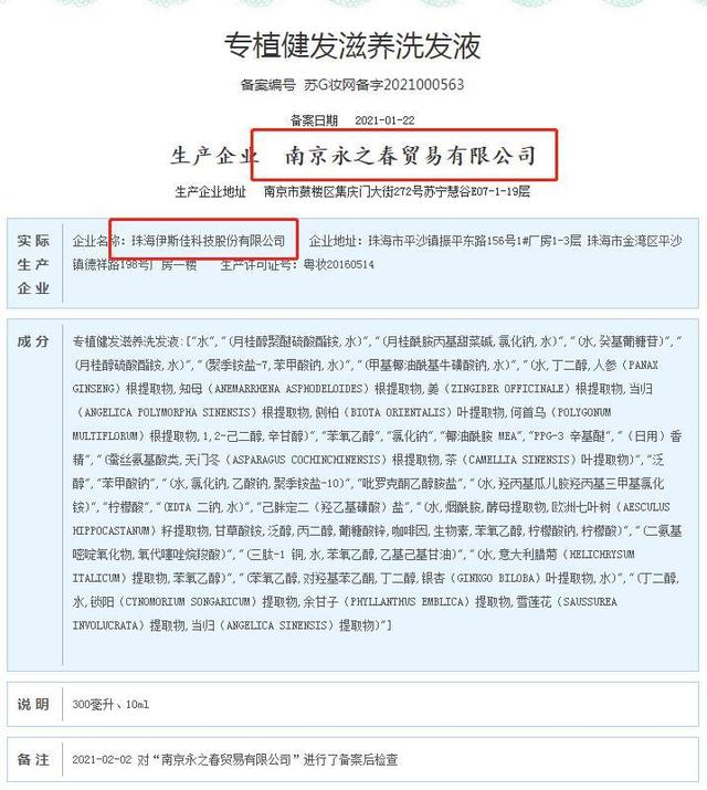 另外,根據(jù)國家特殊化妝品備案管理系統(tǒng),備案生產(chǎn)企業(yè)南京永之春貿(mào)易有限公司,實際生產(chǎn)企業(yè)為珠海伊斯佳科技股份有限公司,而珠海伊斯佳科技股份有限公司為新三板上市企業(yè)。