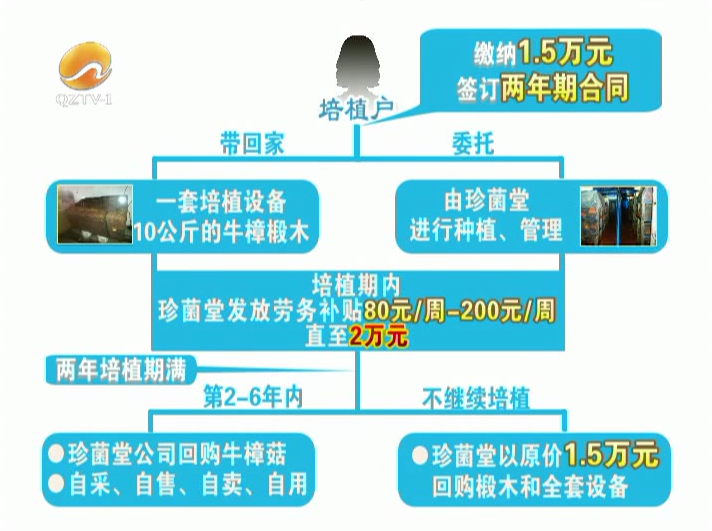 客戶提供本人身份證號(hào)碼、電話號(hào)碼及銀行卡號(hào),以1.5萬元/單(每單由重量為10公斤的植菌椴木、1個(gè)玻璃缸和1個(gè)布套組成)的價(jià)格認(rèn)購加培植模式交納保證金,與福建珍菌堂公司簽訂《協(xié)議書》或者《買賣.回購.合作》,成為培植戶(或會(huì)員)后即可獲得靜態(tài)收益和動(dòng)態(tài)收益,其中靜態(tài)收益即在培植期內(nèi),福建珍菌堂公司按照160元/周/單的標(biāo)準(zhǔn)向培植戶發(fā)放培植補(bǔ)貼,培植補(bǔ)貼與培植戶后期推廣收益達(dá)到2萬元時(shí),終止發(fā)放培植補(bǔ)貼,培植期滿前30日,根據(jù)培植戶申請(qǐng),福建珍菌堂公司以原價(jià)回購椴木和培植設(shè)備,同時(shí)培植戶也可以自行銷售培植產(chǎn)出的朱樟菇;